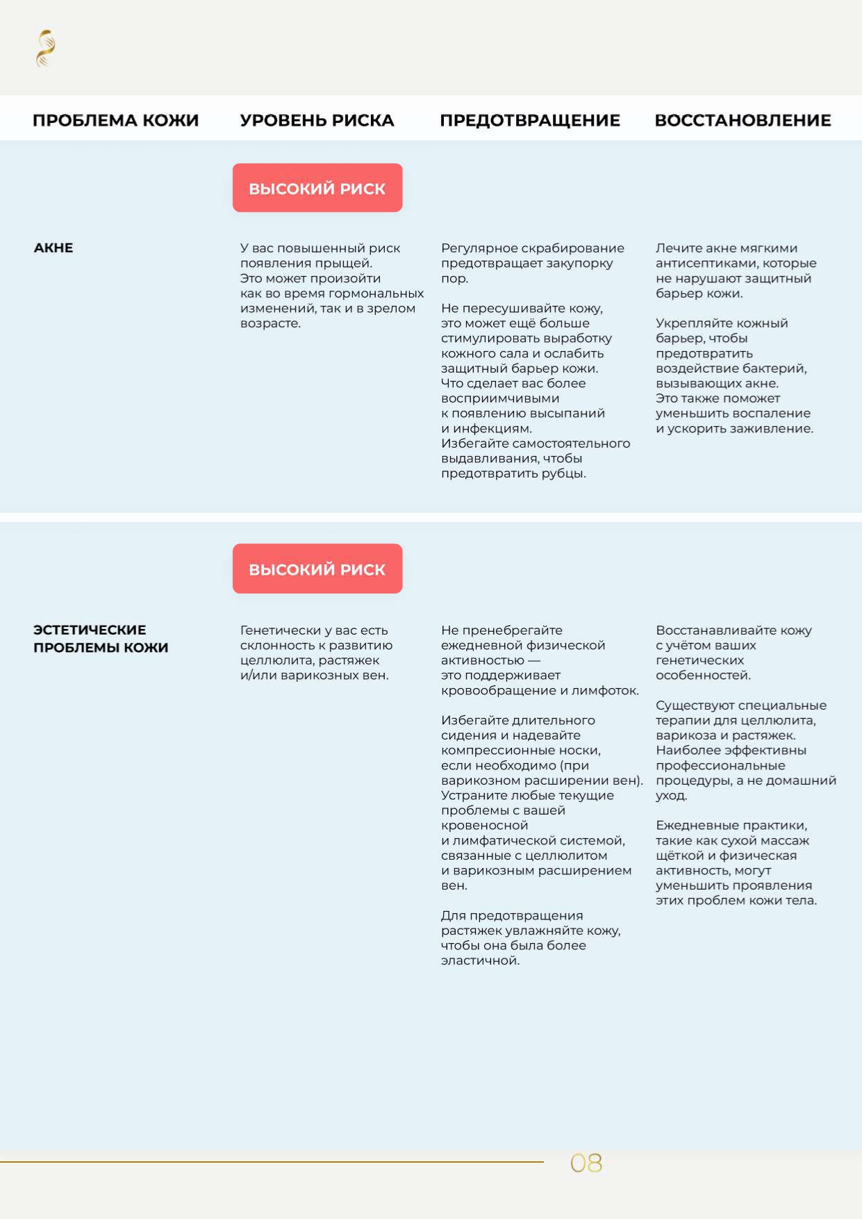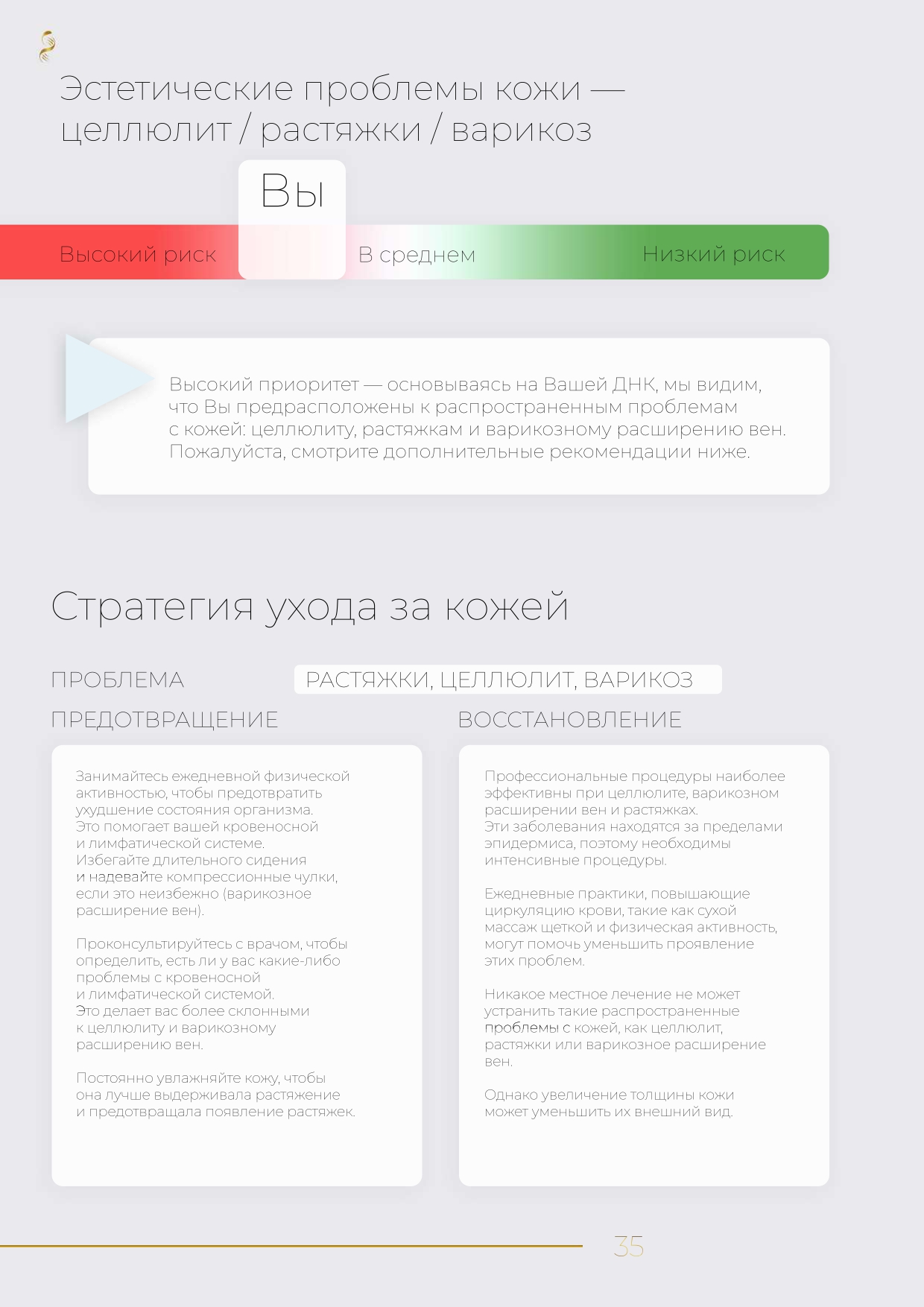 Индивидуальный генетический профиль красоты — это понятный отчет с графиками и диаграммой «Ваша стратегия по уходу за кожей», где наглядно показаны зоны высокого, среднего и низкого генетического риска. Используйте эти данные, чтобы адаптировать свой ежедневный уход и сосредоточиться на том, что действительно важно.